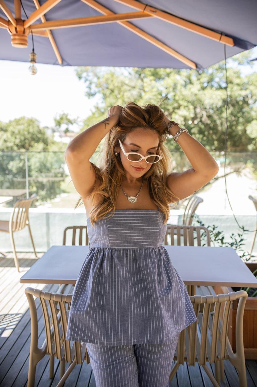 O busto estruturado com acabamento delicado contrasta com a leve amplitude da peça, criando um visual feminino e sofisticado. As listras finas reforçam a estética atemporal, perfeita para composições que vão do casual ao chic com facilidade.
