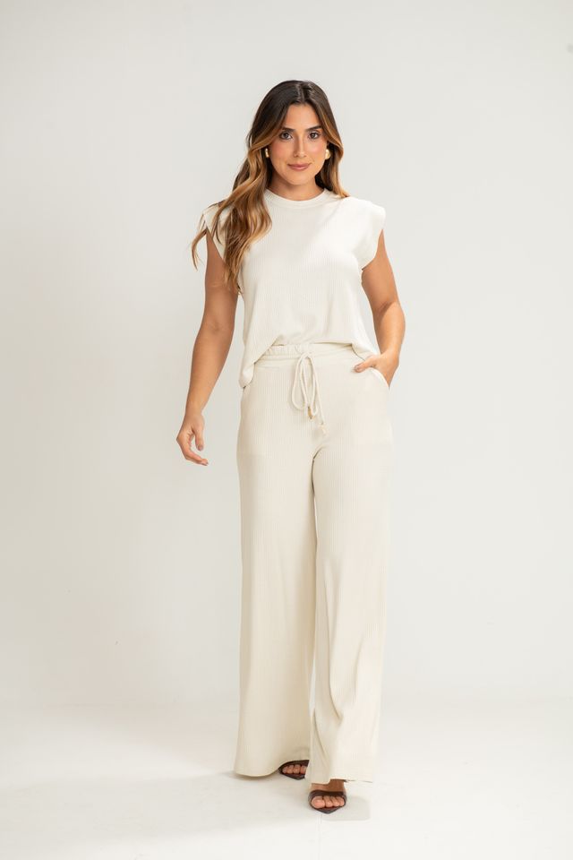 A calça perfeita para unir conforto e estilo! Com modelagem wide leg (pernas amplas) e tecido tricot, essa peça traz leveza ao look sem abrir mão da sofisticação casual. A cintura com elastico e ponteiras metálicas que dão um charme extra. Ideal para compor produções despojadas com t-shirts ou croppeds, e também combina super bem com tênis para um visual moderno e urbano.