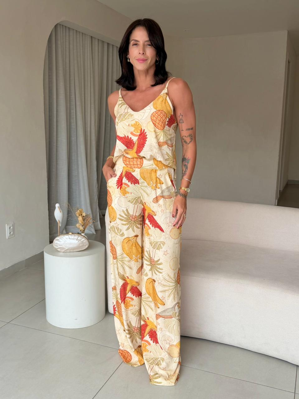 Calça feminina de modelagem pantalona, confeccionada em tecido leve, com caimento fluido e confortável. Possui cintura média com elástico embutido, garantindo praticidade e ótimo ajuste ao corpo, além de bolsos laterais funcionais. A estampa exclusiva traz personalidade e sofisticação, sendo ideal para produções elegantes e descontraídas.