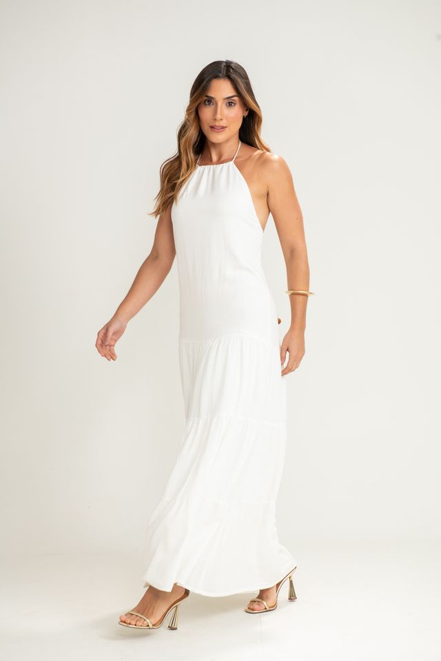Vestido longo, com modelagem fluida e caimento leve, perfeito para produções frescas e elegantes. O modelo possui decote halter, com gola franzida que valoriza os ombros e traz um ar moderno e delicado. A saia é longa com recortes em camadas, criando movimento suave ao caminhar.