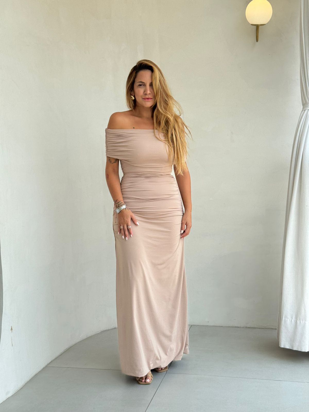 Elegante e feminino, este vestido longo é a escolha perfeita para ocasiões especiais. Com modelagem que valoriza as curvas, ele apresenta um caimento impecável graças ao drapeado que percorre todo o corpo, criando um efeito sofisticado e alongado. O decote ombro a ombro adiciona um toque delicado e sensual, destacando a região do colo.