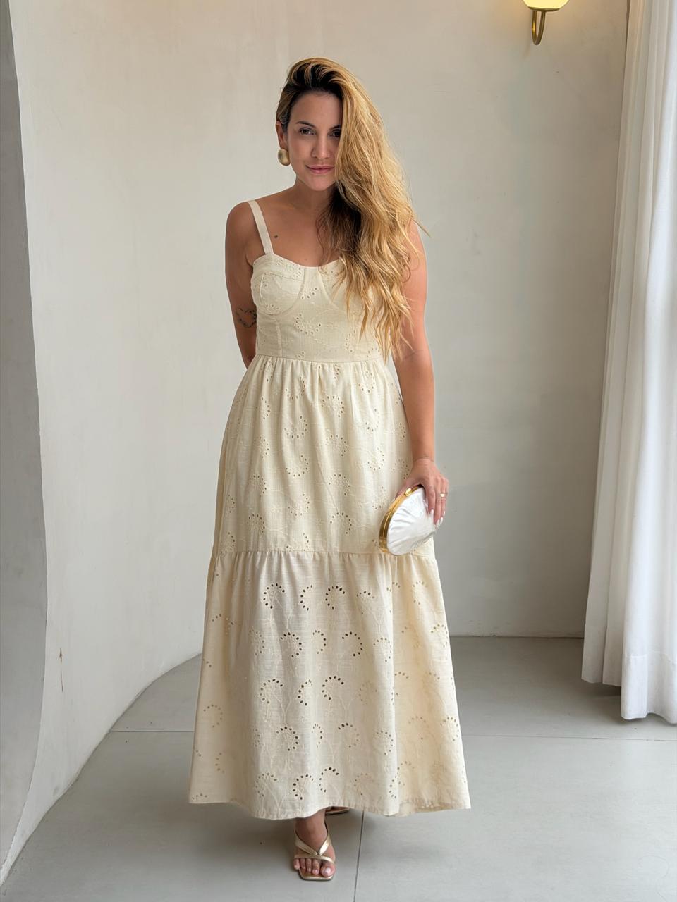 Este vestido longo é a escolha perfeita para quem busca um look elegante e descomplicado. Confeccionado em tecido laise e confortável, ele possui busto estruturado com recorte que valoriza o colo, forro e alças largas que garantem sustentação e charme. A saia com recorte evasê e leve franzido proporciona fluidez e movimento, ideal para dias de calor ou ocasiões especiais ao ar livre.