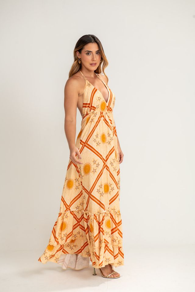 Um vestido cheio de movimento e personalidade. O modelo longo conta com estampa geométrica exclusiva com detalhes solares em tons dourados que iluminam o visual. Possui alças finas, decote em V profundo, recorte nas costas com amarração ajustável e caimento fluido que valoriza a silhueta. O detalhe da barra levemente rodada traz leveza e charme extra à peça.