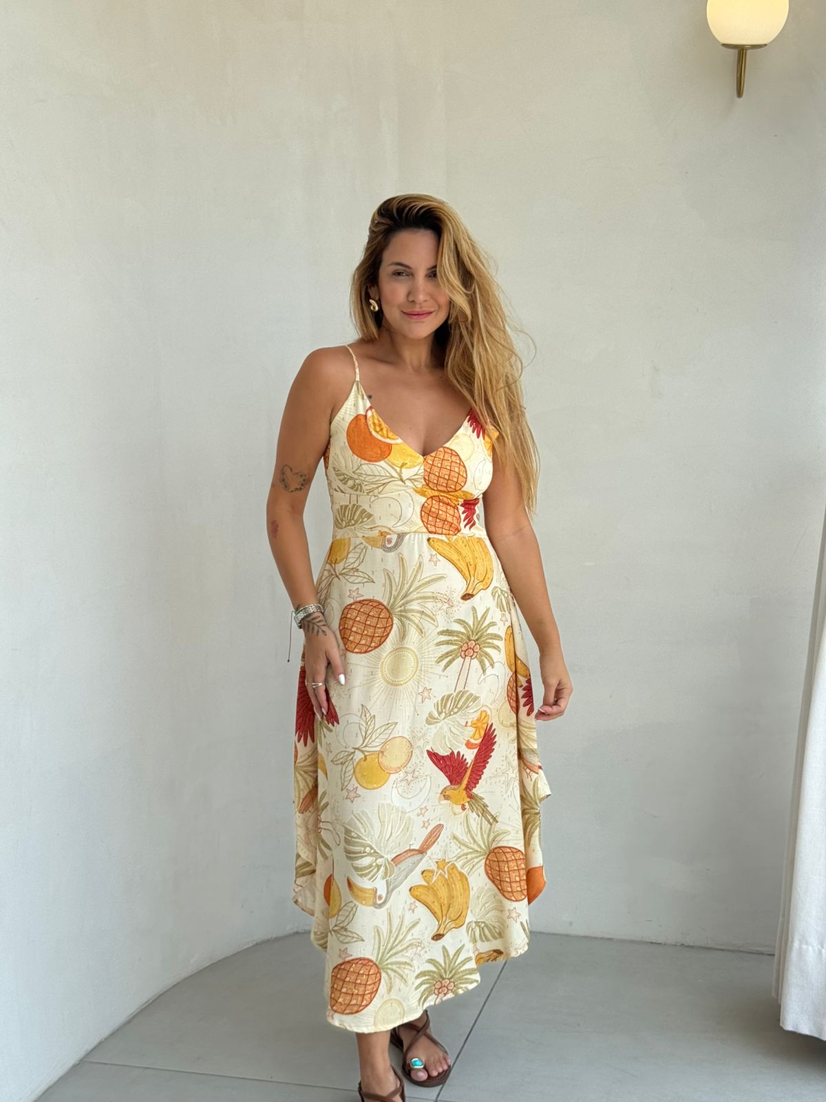 Um vestido que traduz o frescor e a leveza dos dias ensolarados. Com estampa inspirada na tropicalia, ele combina tons vibrantes de coral, amarelo e areia, trazendo um toque natural e sofisticado.
