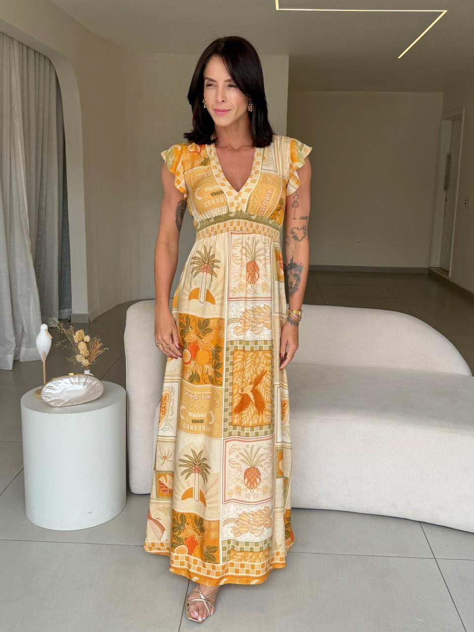 vestido longo feminino confeccionado em tecido leve e confortável, com estampa exclusiva de inspiração tropical. Possui decote em V que valoriza o colo, mangas curtas com leve babado, trazendo feminilidade e charme à peça. A cintura marcada com detalhe em lastex proporciona ótimo ajuste ao corpo, garantindo conforto e elegância. A saia longa com caimento fluido completa o visual, tornando o vestido ideal para produções versáteis — do casual ao elegante, dependendo dos acessórios.